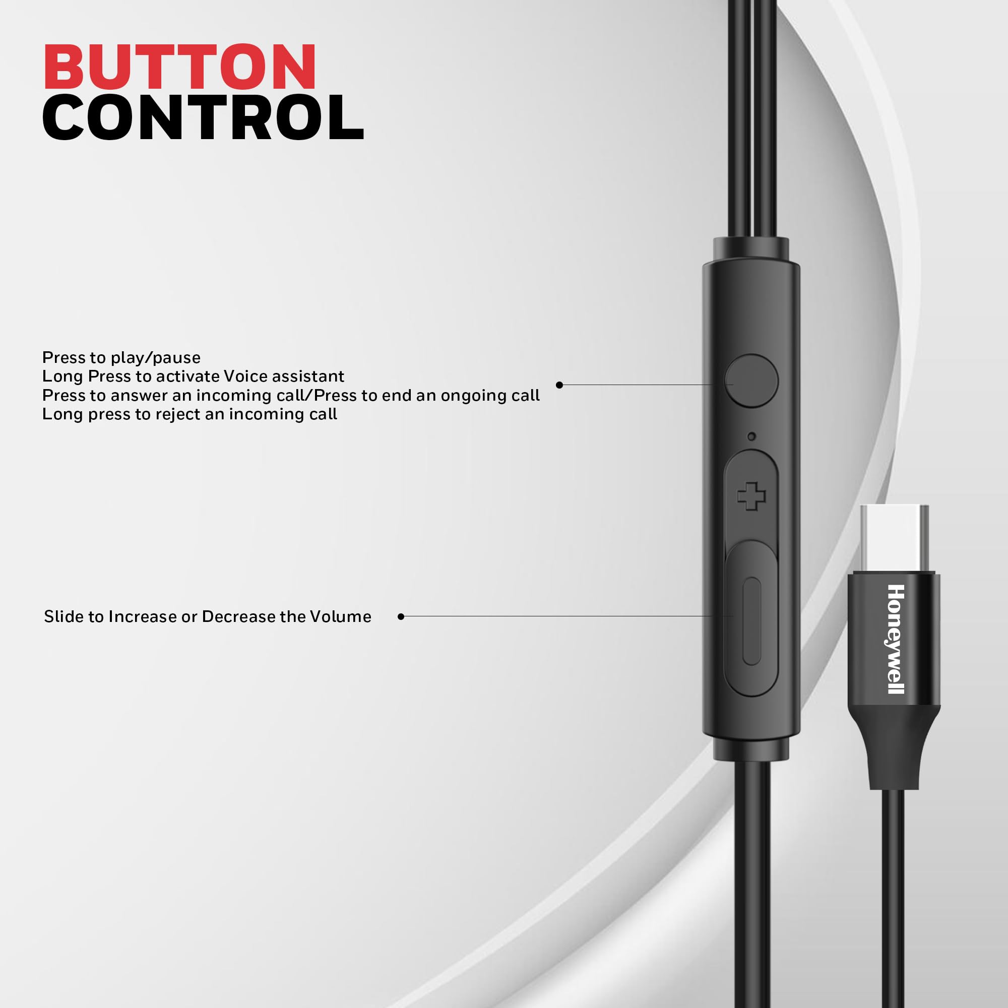 Honeywell Suono P60 Wired Earphones with Built in Mic, 10mm*2 Drivers, Passive Noice Cancellation, Deep Bass & Clear Sound, Ultra HD Mic Quality, Type C Compatible, Voice Assistant Enabled, 1.2 Mtr