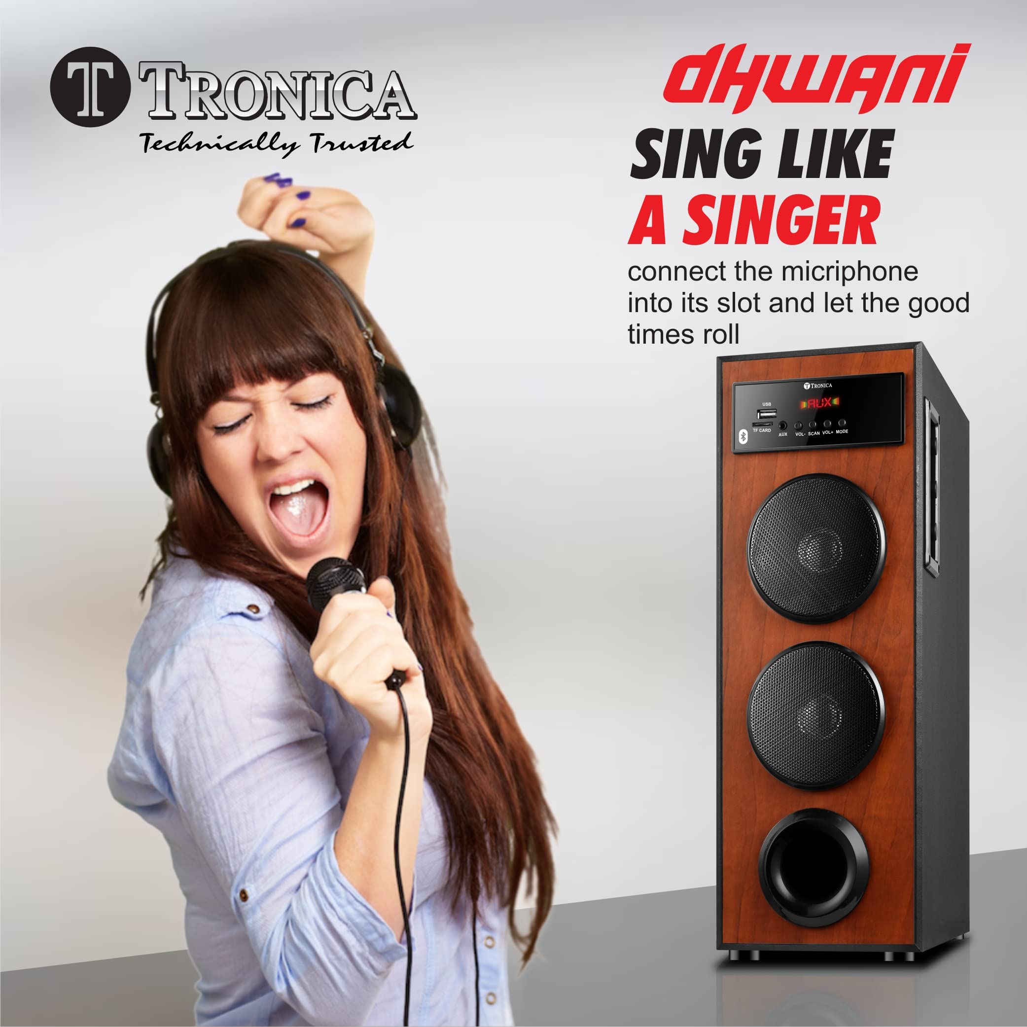 Loud Just Got Smaller: The new and improved TRONICA DHWANI comes with a free wired microphone, delivering powerful 40W DJ-level sound in a compact form. It supports Bluetooth, FM radio, Pendrive, SD card, Microphone, and AUX input for versatile entertainment. The included remote control makes it easier to manage functions from a distance, ideal for quick adjustments during parties or gatherings.