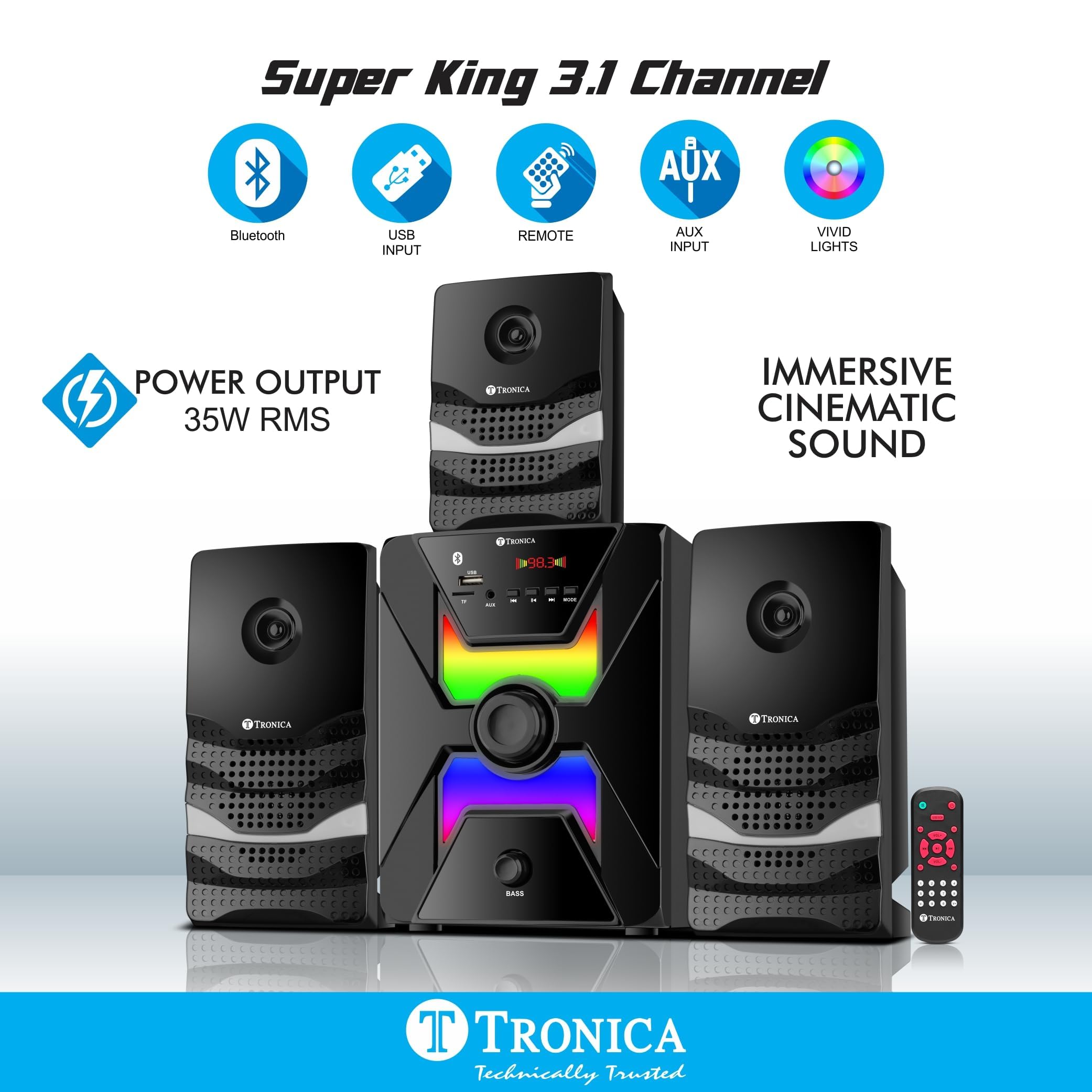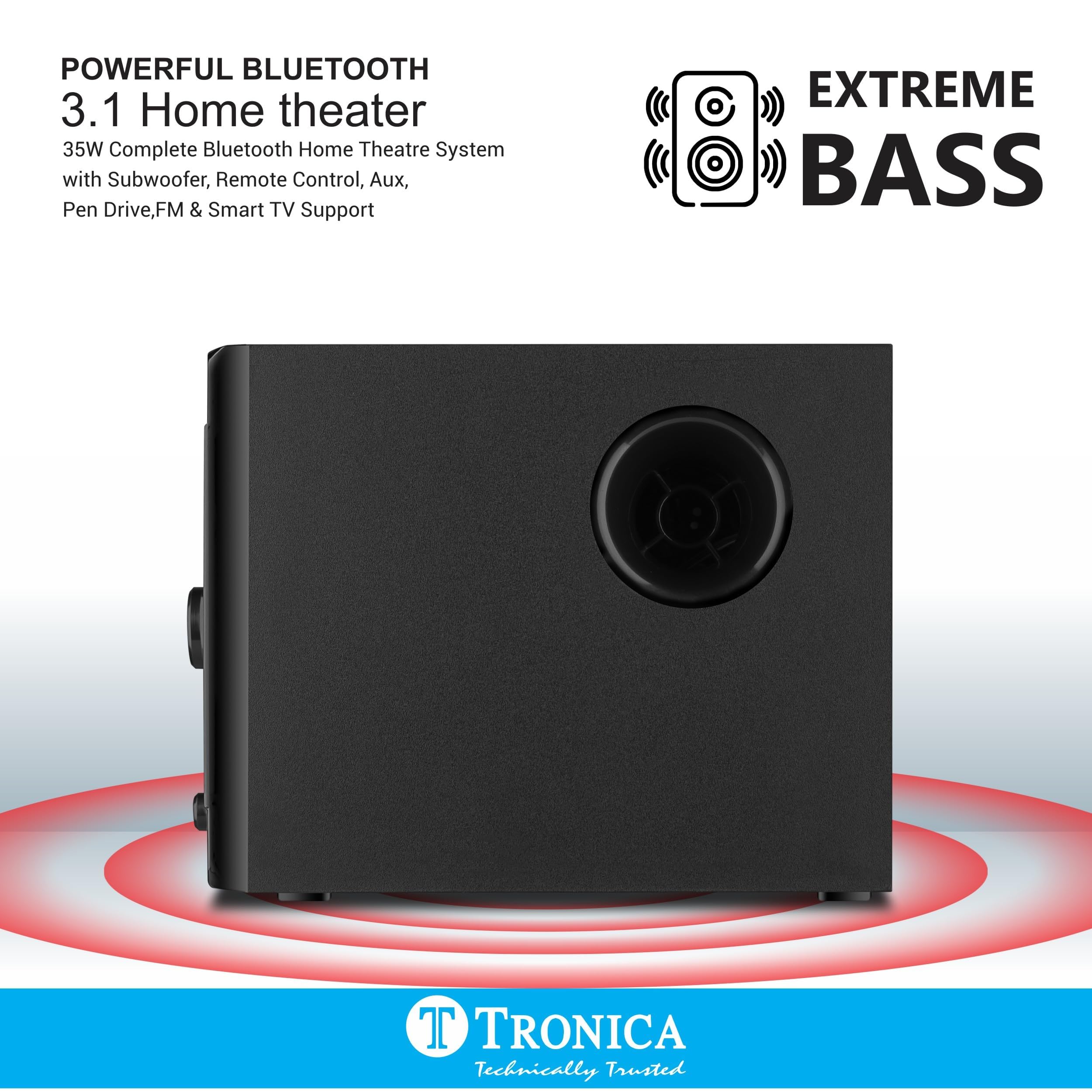 Details: We at TRONICA, develop different new AUDIO machines to suit the requirements of a fellow INDIAN! Forget the costly SOUND BARS, this home theatre completely solves the purpose of good sound effects at less than the half price. Transform your home entertainment experience with this sophisticated 3.1 channel home theatre system. The sleek black design features striking three speakers that add a touch of elegance to any room. The system includes three satellite speakers and a powerful subwoofer for immersive sound that brings your favourite films and music to life. Each speaker showcases premium craftsmanship with its shiny finish and metallic accents. The convenient remote control allows easy adjustment of volume and audio settings from anywhere in the room. The subwoofer unit houses essential connectivity options including USB input for playing media directly. Whether you’re watching action-packed movies or enjoying your music collection, this home theatre system delivers rich, room-filling sound with deep bass and crystal-clear acoustics. The compact yet powerful speakers are ideal for medium to large living spaces while maintaining an aesthetically pleasing presence.